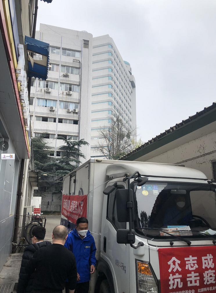 红原乳业董事长谢剑先生(右一)与四川省扶贫基金会副会长兼秘书长陈宏先生(中)、润宝物流总经理杨志翔先生(左一)亲到现场指挥工作。